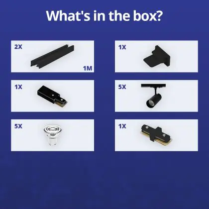Beschreibung Komplettset 1-Phasen Rail 2 Meter Schwarz | incl. 5x Spot + GU10 2700K 3W Dimmbar + Abschlusskappe, Stromanschluss und I-Verbinder