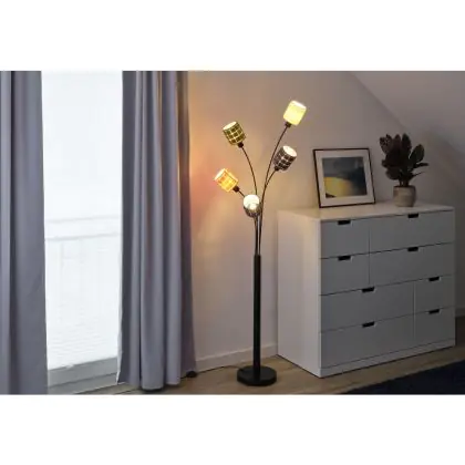 Da das Leuchtmittel nicht enthalten ist, empfehlen wir Ihnen die Verwendung von energieeffizienten LED-Lampen mit E14-Fassung. Je nach gewünschtem Effekt können Sie zwischen warmweißem, neutralweißem oder kaltweißem Licht wählen. Dimm-Optionen stehen ebenfalls zur Verfügung, sofern die Stehlampe mit einem entsprechenden Dimmer ausgestattet ist.