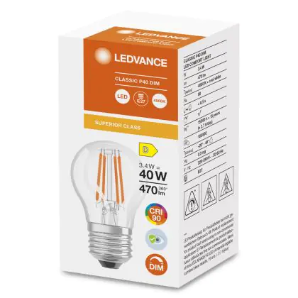 Die Ledvance Superior Classic LED E27 Kugel Fadenlampe Klar 3.4W 470lm - 940 Kaltweiß | Dimmbar - Höchste Farbwiedergabe ist eine effiziente E27 LED-Lampe mit Retrodesign und der perfekte Ersatz für Ihre konventionellen 40W Lampen mit E27. Zudem strahlt sie Licht in der Farbtemperatur 4000K - Kaltweiß aus und punktet durch eine lange Lebensdauer.
