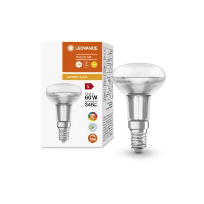 Der Ledvance Superior R50 LED E14 Spot Matt 4.8W 345lm - 927 Extra Warmweiß | Dimmbar - Höchste Farbwiedergabe ist ein leistungsstarker LED-Strahler mit E14-Sockel. Er kommt mit einer hohen Lebensdauer von 25000 Stunden daher und spart Ihnen somit nicht nur Energie-, sondern auch Austausch- und Wartungskosten. Im Preis ist zudem eine All-In-Garantie von 3 Jahre enthalten.
