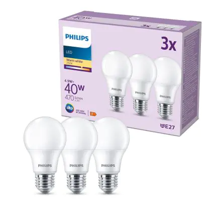Die Mehrfachpackung 3x Philips Glühbirne LED E27 Birne Matt 5W 470lm - 827 Extra Warmweiß ist eine effiziente E27 LED-Lampe und der perfekte Ersatz für Ihre konventionellen W Lampen mit E27-Sockel. Zudem strahlt sie Licht in der Farbtemperatur 2700K - Extra Warmweiß aus und punktet durch eine lange Lebensdauer.