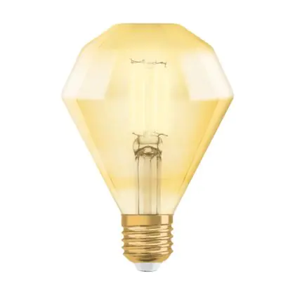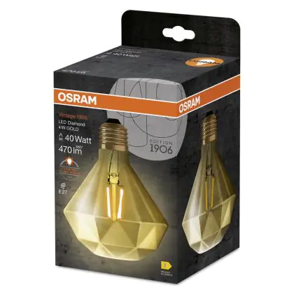 Die Osram Vintage 1906 LED E27 Diamond 4.5W 825 Gold | Ersetzt 40W ermöglicht enorme Energieeinsparungen von bis zu 90 %. Dank des Standard-E27-Sockels klappt der Umstieg auf LED besonders einfach. Die Goldbeschichtung und die sichtbaren Filamentstäbe im Inneren des Leuchtkörpers machen die Vintage-LED zu einem echten Highlight. Der Leuchtkörper ist begeistert mit einer Diamant-Form.