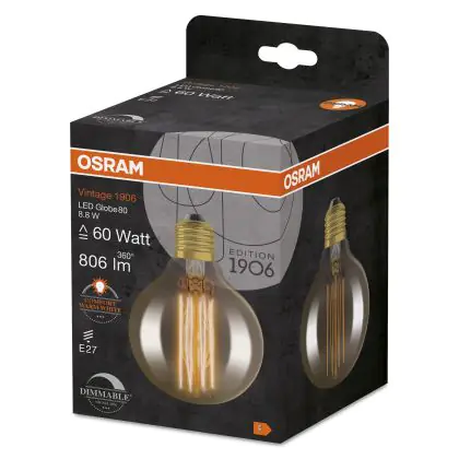 Die Osram Vintage 1906 LED E27 Globe Filament Gold 80mm 8.8W 806lm - 822 Extra Warm White | Dimmable ist eine effiziente E27 LED-Lampe mit Retrodesign und der perfekte Ersatz für Ihre konventionellen 60W Lampen mit E27. Zudem strahlt sie Licht in der Farbtemperatur 2200K - Extra Warmweiß aus und punktet durch eine lange Lebensdauer.