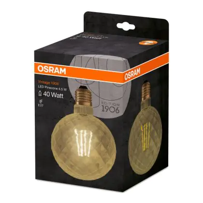 Die Osram Vintage 1906 LED E27 Pine 4.5W 825 Gold | Ersetzt 40W ermöglicht enorme Energieeinsparungen von bis zu 90 %. Dank des Standard-E27-Sockels klappt der Umstieg auf LED besonders einfach. Die Goldbeschichtung und die sichtbaren Filamentstäbe im Inneren des Leuchtkörpers machen die Vintage-LED zu einem echten Highlight. Der Leuchtkörper ist begeistert mit einer Pinien-Form.