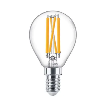 Die Philips Master Value LED Lustre E14 Kugel Fadenlampe Klar 3.4W 470lm - 927 Extra Warmweiß | Höchste Farbwiedergabe - Dimmbar - Ersatz für 40W ist eine effiziente E14 LED-Lampe mit Retrodesign und der perfekte Ersatz für Ihre konventionellen 40W Lampen mit E14. Zudem strahlt sie Licht in der Farbtemperatur 2200K - 2700K Dim To Warm aus und punktet durch eine lange Lebensdauer.