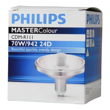 Die Philips CDM-R111 70W 942 GX8.5 24D (MASTERColour) Entladungslampen haben einen sehr guten Farbwiedergabeindex von 90-100Ra. Diese Lampe spendet ein helles weißes Licht (4200K). Der UV-Filter sorgt dafür, dass wärmeempfindliche Objekte keinen Schaden tragen und sich nicht verfärben.